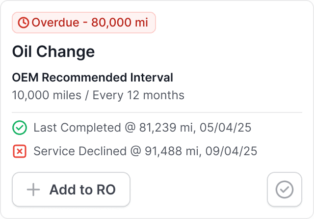 Automatically find the gaps in vehicle service history agains OEM and shop service intervals. Add recommendations to estimates and inspections in a single click.